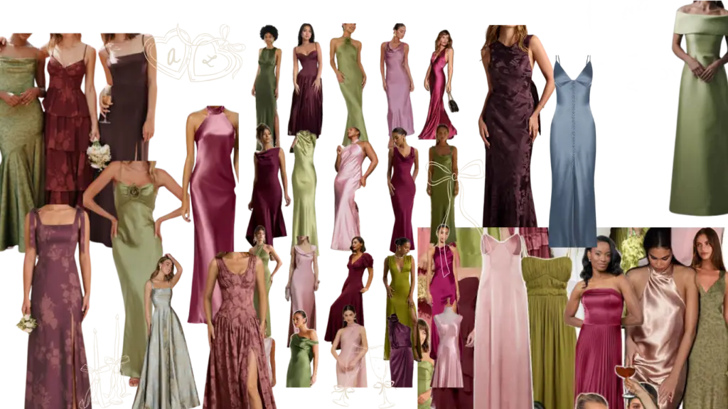 We’d love to see flowing gowns, satin or silk textures, florals, or velvet in any of these tones.
